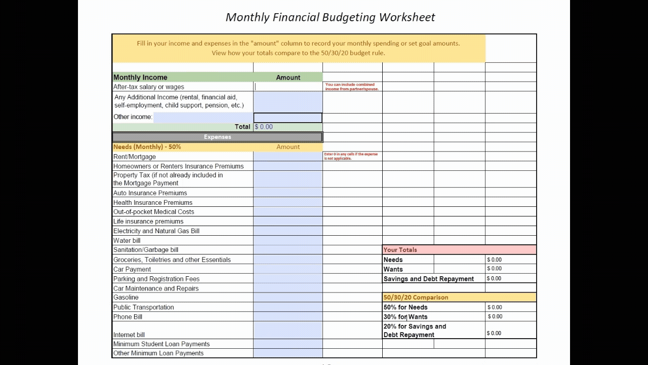 Get your finances in order with this worksheet using the 50/30/20 Rule. Once you download the worksheet, open the file, select the PDF or Excel version, and enter the amounts directly onto the form. The embedded formulas will calculate the items for you. Easily save to your files for record keeping.